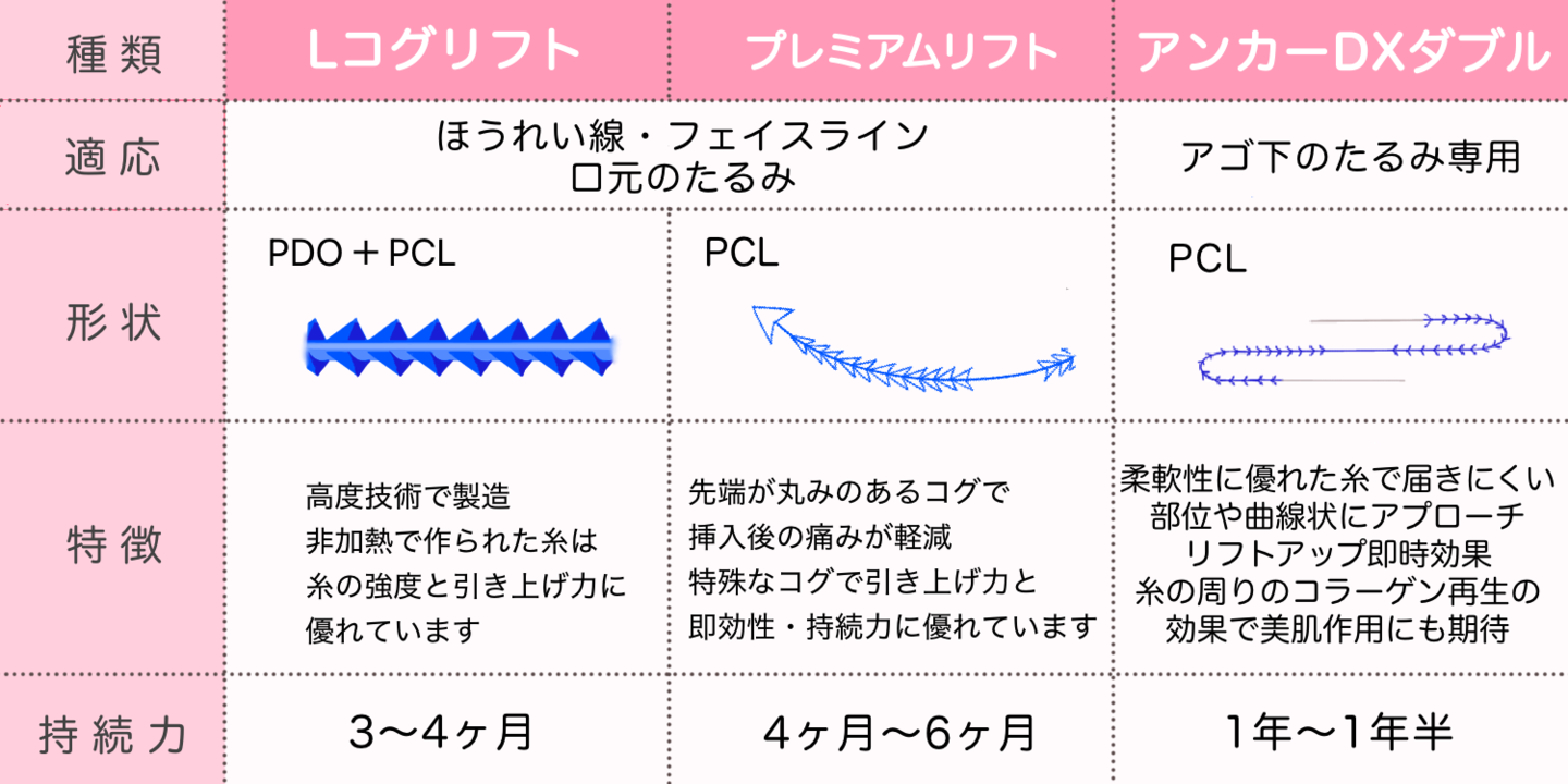 これまで日本でよく利用されていた糸は、医療用のポリプロピレンなどからできた溶けない糸でした。(アプトス、ワプトス、フェザーリフト、ミラクルリフト、ミントリフト、シルエットリフト、スプリングリフトなどと呼ばれています)。